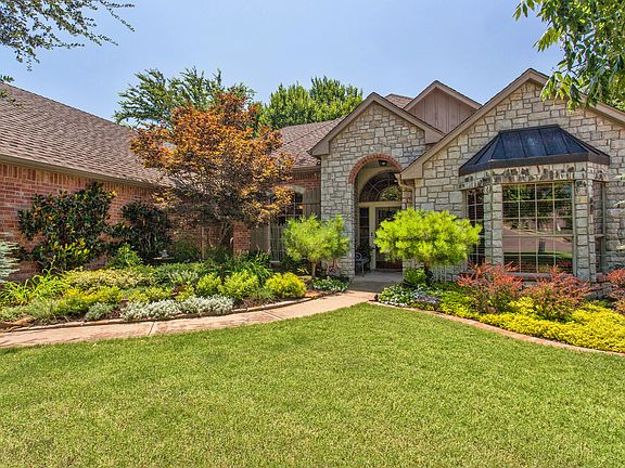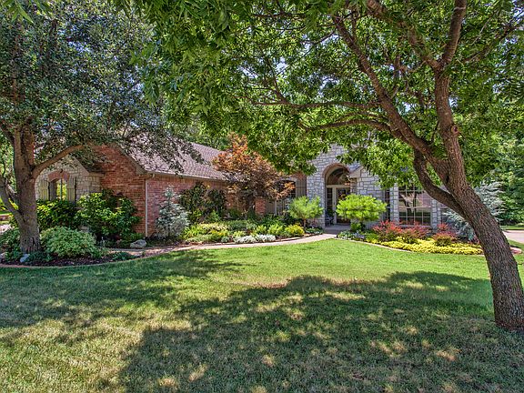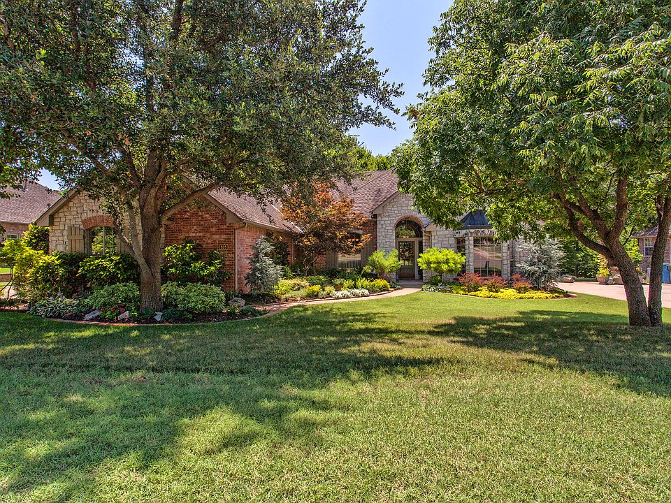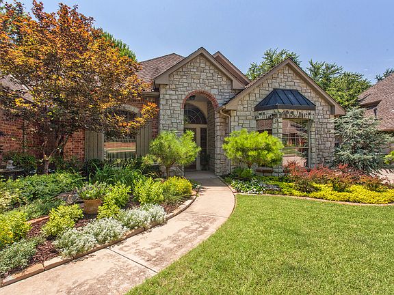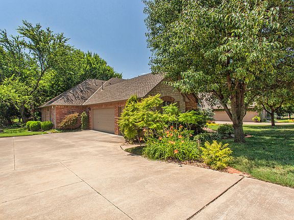 Gorgeous home with incredible outdoor living space backing to greenbelt and mature trees. All on one level. Beautifully updated and maintained with wood floors at entry through and into kitchen. 3 Bedroom, 2 1/2 baths, 2 living spaces both with fireplaces plus study. Spacious kitchen with large center island, built-in refrigerator, double ovens, 2 pantries, microwave and ice maker. Large office with built-ins, cathedral ceilings and fan. Master bath has been updated with granite, faucets, shower and hardware. Lots of cabinets and storage. Well manicured landscaping, 3 car garage, huge outdoor brick-paver patio area plus covered patio. Storm shelter in garage. Edmond schools