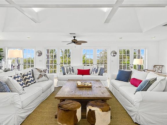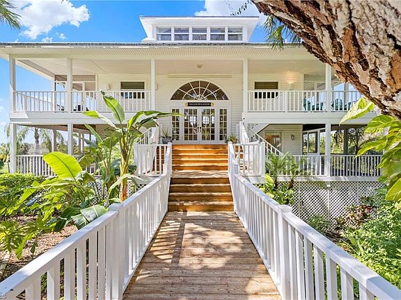 The approach to this grand, casually elegant home atop the highest point on Useppa Island takes you through luscious vegetation, under a huge vine-bedecked ancient Live Oak, up wide stairs to a magnificent entry to split level comfort. Designed to provide ample room for large family gatherings and active socializing with quiet, personal, private spaces. 5 bedrooms, 3 1/2 baths with the master suite on the third floor, boasting 360-degree windows with views across the ICW and Pine Island Sound and is within earshot of the Gulf. Shaded by Live Oaks from bright morning rays, enjoy spectacular westerly sunset views. The first and second floors feature deep, wraparound porches. The great room takes up the 2nd floor with a large dining area, kitchen and seating areas with room to play games, sit by the fire or just watch sea birds sail by. Four bedrooms on the lower level share 2 baths and wraparound decks. The floor below is an open decked area for storage or expansion. If you are looking for togetherness with privacy, seclusion but quick access, a community that is active, casual, small and reminiscent of days of old but without obligatory mores, look at this property.
