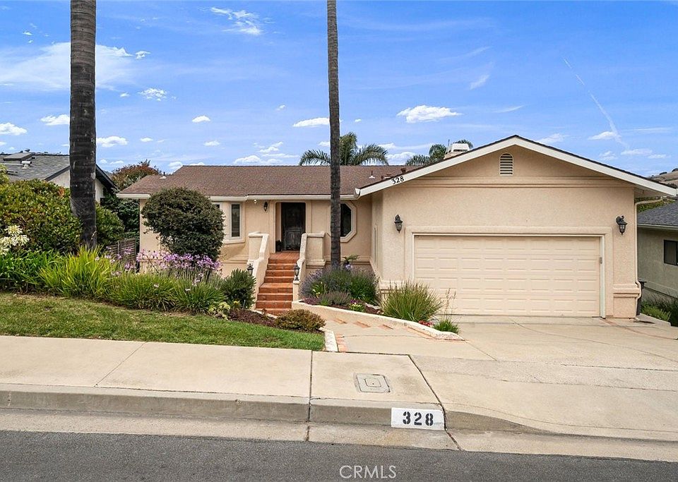 Welcome to 328 Valley View Drive in Pismo Beach, CA! Discover coastal living at its finest in this beautifully appointed 3-bedroom, 2.5-bath home nestled in one of Pismo Beach's most desirable neighborhoods. Spanning 2,117 square feet, this thoughtfully designed home offers comfort, style, and endless opportunities for outdoor living. From the moment you arrive, you’re welcomed by a charming entry courtyard surrounded by low-maintenance landscaping, a peaceful spot to enjoy your morning coffee or evening sunsets. On the main level, enjoy an open and airy living space featuring vaulted ceilings, rich cherry wood floors, a cozy dining nook, and a separate family room with fireplace. The chef’s kitchen features ample wood cabinetry, high-end stainless steel appliances, granite countertops, glass tile backsplash, durable tile flooring, a skylight, and a large picture window with breathtaking views of the adjacent oak woodlands. Downstairs, you will find two comfortable guest bedrooms and a recently updated full bath with a quartz dual vanity and soaking tub. Just down the hall is the primary suite, featuring a sizable walk-in closet and a remodeled ensuite bathroom with custom tiled shower and white marbled quartz double vanity. Step just outside to your private covered deck that overlooks the spacious, tree lined yard. The lush backyard is a serene escape, with towering queen palms, two lawn areas, fruit trees (including apple and plum), and a concrete patio suited for a spa. The expansive upper deck, made with low-maintenance composite materials, provides panoramic views of nearby hillsides and old growth oak trees behind the home. At the front of the home is an oversized two-car garage with work bench, built-in cabinets for storage, and full size windows that provide natural light. Just inside from the garage is a dedicated laundry room with pet door, and a powder room. Located in a well-kept neighborhood that enjoys the Central Coast’s temperate Mediterranean climate, this property is just minutes from beaches, hiking trails, downtown Pismo Beach, and the nearby towns of San Luis Obispo, Avila Beach, and Arroyo Grande. Don't miss this opportunity to live the beach lifestyle on the Central Coast.