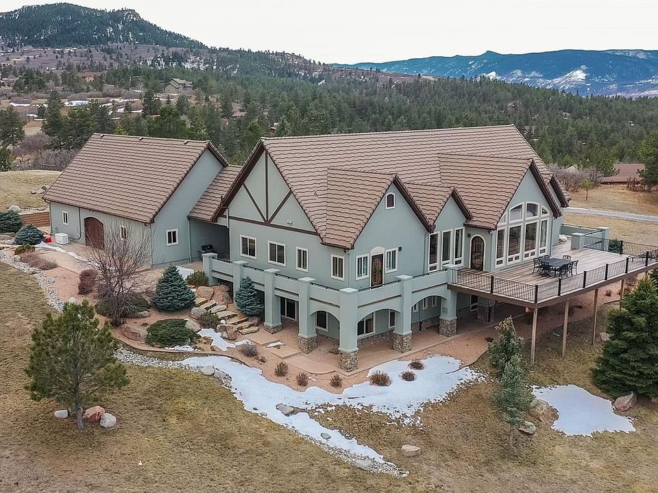 Breathtaking mountain views from this custom ranch, 8.86 acres, horses welcome!! Pull into your private gated oasis, away from everything, but 15 min to everything in Castle Rock. Exceptional custom finishes, hand crafted doors, floor to ceiling windows, dramatic views, stone fireplace, wood floors, great room opens to the kitchen and outdoor space. Custom cabinetry, Wolf oven and Sub zero refrigerator, new Bosch dishwasher, warming drawer in center island, ice maker, on demand hot and cold water. Huge walk in pantry, extensive storage cabinets. Access to the 1500+ Sq Ft deck from the great room, master, and dining room. Primary suite has a wet bar, fridge and microwave, 2 walk in closets. Main floor office with separate entrance, secondary main floor bedroom en suite. Huge laundry and mudroom. The finished walk out lower level features a full kitchen, pool table and family room, 2 additional bedroom suites, also with amazing views. Enjoy plenty of parking with the additional 1600 sq ft heated barn/garage,RV storage or recreational storage, can be converted into a horse barn, plenty of pasture for grazing. New whole house Generator 2022, exterior painted in 2021.