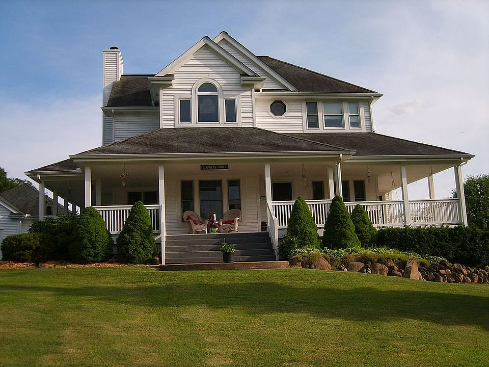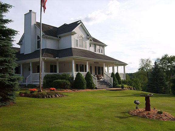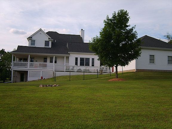 5 acres (250 x 880) of rolling terrain with pond, completely fenced. This first floor master is a dream home with wrap around country porch. Two story great room with custom stone fireplace. Expansive kitchen with nook overlooking pond. Dining room with hardwood floors and French doors. Finished walkout with fourth bedroom or office, family room with fireplace, full bath. All the best in a classic home with all the modern conveniences.