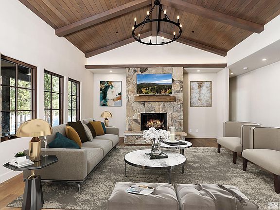 When you first enter this easy living Mountain Cottage home situated on the pristine Coore & Crenshaw designed Clear Creek Tahoe golf course; you know you're home. This single-story custom home provides an ideal setting for family, friends and entertaining. Enjoy meeting new friends in a welcoming new home community boasting nearly 65% full time residents. Your backyard feels endless as the home sits on the 508 yard, par 4 hole known as the Aerie on the #1 private golf course in Nevada., Sliding back doors open to a large outdoor living area complete with firepit, barbecue, covered and uncovered patios all designed to provide a relaxing environment as you take in the beauty of the setting sun across this top-rated golf course and majestic Sierra ridge tops. The primary bedroom has high ceilings, a large stone fireplace, spacious tub, steam shower, and access to a private back patio. On the far side are two spacious junior suites allowing guests plenty of privacy. The Chef’s dream kitchen features stainless appliances, granite counters and large island which opens to the great room featuring a towering stone fireplace and vaulted wood ceilings. Off the dining area is a handy office/study for those who still need a quiet place to work or read. From the front porch you can start the morning watching the sun rise over the awe-inspiring granite rock outcroppings while preparing for a day of endless adventure. All this unfolding in the luxury private community of Clear Creek Tahoe. The home is located just a short stroll from the heart of Summit Camp which offers har-tru tennis courts, pool, hot tub, towering water slide, sports court, pool side grill, bocce and more! Social membership to the club is included and offers access to all amenities, (excluding golf) - including a private lakefront property on Lake Tahoe which operates as a beach club in the summer and ski house in the winter, private hiking trails and an impressive clubhouse complete with workout/wellness facility.