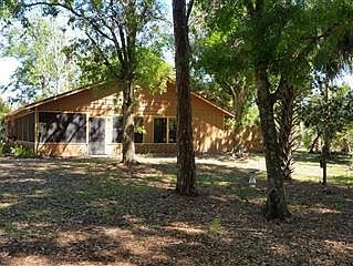 Check out this opportunity to own a beautiful custom home with guest house on a fabulous country setting in a premier community. The home has a massive screened patio, genuine wood finishes throughout, a fully equipped kitchen, one of a kind tile counter-tops, breakfast bar, plus a formal dining room area, which all opens to the great room featuring a gorgeous stone fireplace. The floor plan is perfect for entertaining. The home has updated bathrooms and large bedrooms. The master bedroom has both a private bathroom and it's own screen patio retreat with nature views. Beyond the main house is the detached guest house, with large party room, bedroom, full bathroom and the two car garage with work-shop area. Buildings are nicely maintained, all metal roofs, updated equipment & fenced.