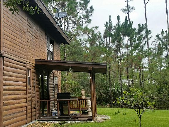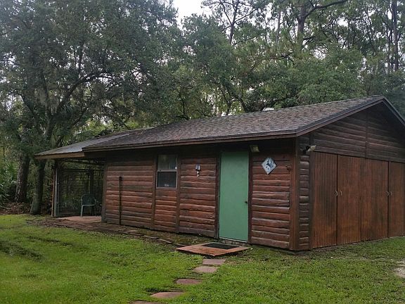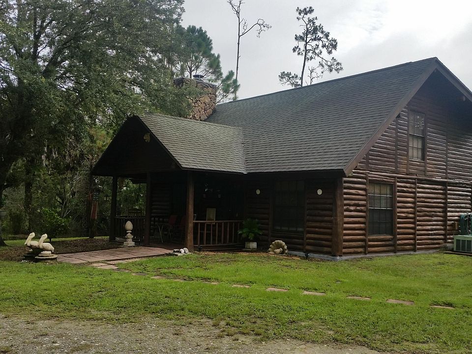 Genuine Log Cabin For Sale in a picture perfect setting on 2.5 acres. This home was built to last and has been well maintained. 2 bedroom and 2 full baths, room for a 3rd bedroom, den or office. The great room features a fabulous stone fireplace and open log vaulted ceiling sure to wow you upon entry! Chose the location of your master bedroom, upstair or downstairs. The open to below loft is currently featured as a master suite with plenty of custom storage space. The out building will come equipped with handy maintenance items to include a new generator. The rear of the detached garage had stalls for horses with a tack room, now has pavers for a patio area. Indian Hammock features a gym, stables, lodge, pool, billiards, shooting ranges, skeet shooting, hunting, air -strip and horse trail
