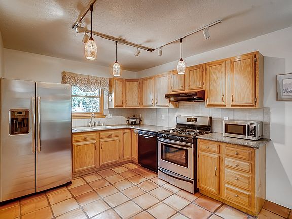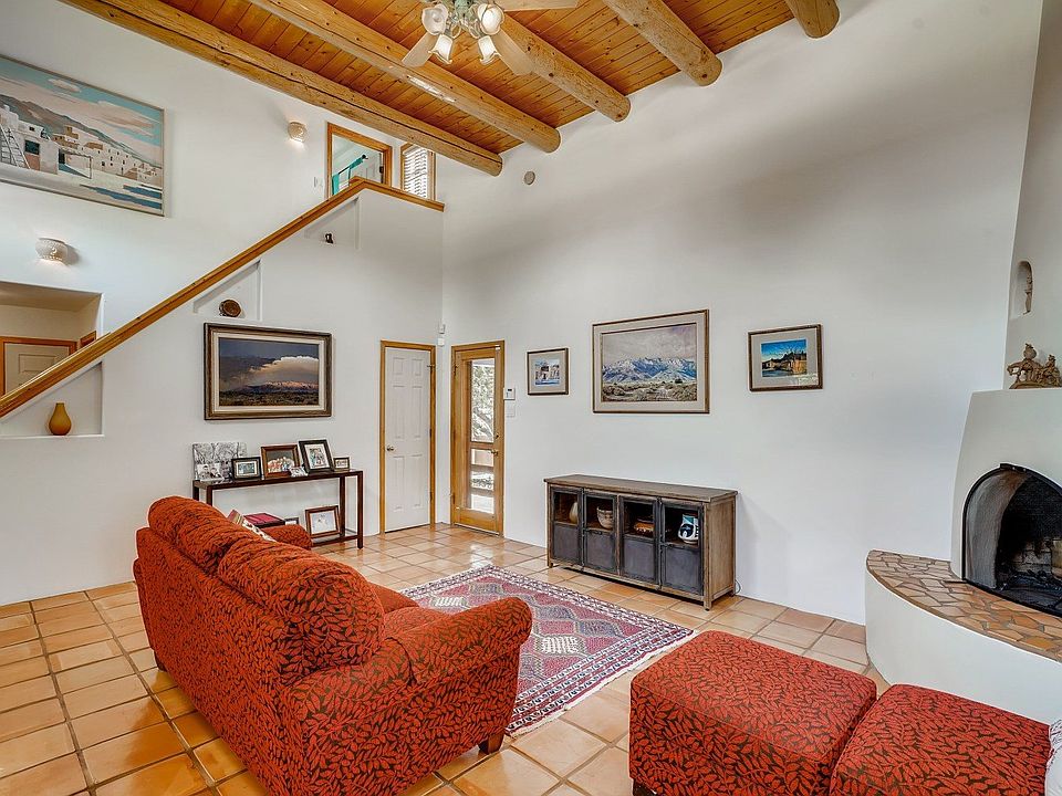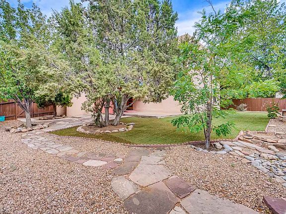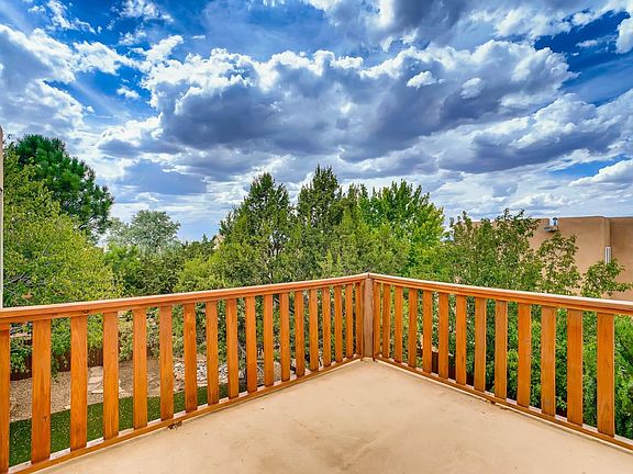 Charming home with many upgrades which include: Pella wood windows; stainless kitchen appliances including nearly new refrigerator, upgraded counter tops, refrigerated mini ductless AC in master bedroom and wonderful back yard with mature shade trees and handy storage shed. The home welcomes you in with high viga ceilings in living room, 2 bedrooms downstairs and master suite upstairs. Great useable deck on second floor with wonderful Sangre views. Upbeat designer touches throughout the home. Handy breakfast nook at end of kitchen can be expanded to dining room and the appealing yard is fully landscaped and includes raised planting beds, mature shade trees and a covered portal with living room access. Great curb appeal as well with sweet front yard. The 2nd level master suite includes a two sink vanity, walk-in closet plus the deck. The home has been recently repainted and the downstairs bedrooms have new carpet. Master has engineered wood floors and its own view of the Jemez. The foam roof was installed by Southwest Spray Foam in Sept. of 2014 and comes with the balance with of a 10 year warranty. Convenient to shopping - come see this one!