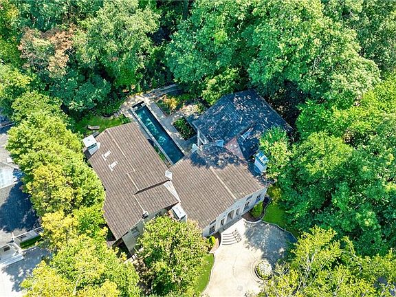 Inspired by Andrea Palladio's masterpiece, Villa Poiana, this Exquisite Tuxedo Park custom home offers truly beautiful and unique architecture throughout the property including custom window details, elegantly designed front entry and custom crown molding. Grand entrance foyer with marble flooring leads to oversized dining room and living room, both featuring a fireplace. Beautiful floor to ceiling windows through the home offers alot of natural light. French doors throughout the entire back of the house all open to the pool, ideal for entertaining. Kitchen opens to the breakfast room and includes island, gas range, wood burning oven from Provence, stone counters and marble flooring. Tucked away at the rear of the home, a richly paneled solid walnut den offers the perfect space for a private office or library. A spacious guest suite with full bath is located on the main level. Upstairs, the luxurious primary suite enjoys complete privacy via its own staircase and features a walk-in closet, dual-vanity en-suite bath with separate shower, and a serene private balcony. A second staircase on the opposite wing of the home leads to two additional bedrooms and a full bath-ideal for family or guests. The dual staircases do not connect, enhancing privacy and flexibility in layout. Basement has access to the 3 car garage (one garage in tandem). Gorgeous manicured grounds include lap pool, spa and level yard. Parking pad in the front of the house as well.