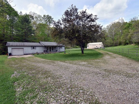 Tucked away on 8.78 beautiful acres, this 3-bedroom, 2-full-bath ranch-style home offers the peace and privacy you've been looking for. The split bedroom floorplan provides added privacy, while both a living room and a family room give you plenty of space to spread out. Two decks on the back of the home overlook a scenic wooded hillside, with a tranquil creek running through the property. Just over the hill you'll find a pond perfect for fishing or simply enjoying nature. Two barns offer endless possibilities for storage, animals, or hobbies. With a little TLC, you can transform this property into your own personal retreat- full of charm, space and potential.