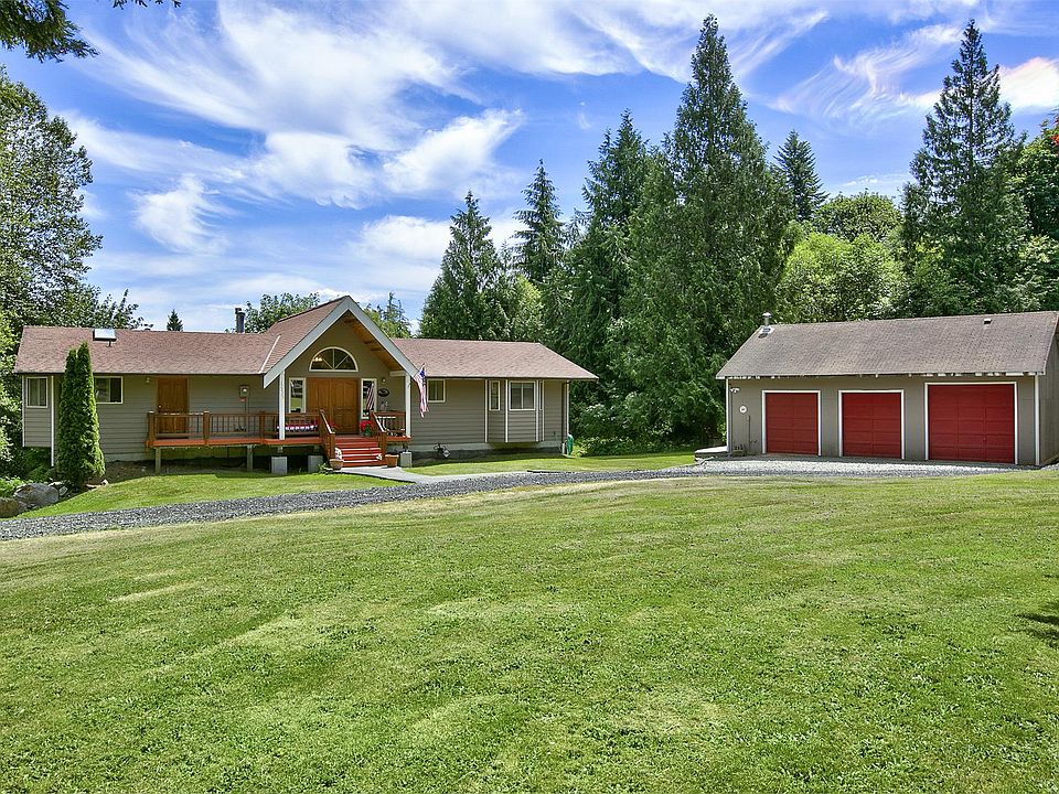 Selling AS IS, a gorgeous daylight basement rambler set on over 5 acres of secluded park-like setting in the north Arlington area.Boasting a 2-car attached garage & a fully finished 3 bay detached shop! This home enjoys almost 3,000 of living space w/bonus room & office on the lower floor. Soaring ceilings in the living room, coupled w/a wall of window s w/mountain views continuing into the large kitchen w/breakfast bar! Beautifully updated 5-piece master bath w/stunning tile work & skylights!A MUST see!