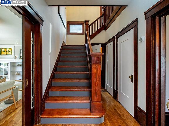Located in one of Alameda's most desirable East End neighborhoods, this fabulous 2-story 1915 home offers exceptional Craftsman details combined with thoughtful contemporary updates. Situated just 1 block to Lincoln Park/pool and convenient to Edison Elementary and Lincoln Middle schools, this special vintage home features 3 bedrooms, 2.5 bathrooms, formal living and dining room (currently used as a family room), an eat-in kitchen (with Wolf, SubZero and Bosch appliances), a garage, and a fully finished 3rd-floor attic bonus space that makes a wonderful playroom or home office (388 SF, measured). Beautifully maintained vintage architectural details include 9-foot ceilings throughout, oak floors with rosewood borders, wainscot paneling with plate rails, a coffered dining room ceiling and the original stained glass transoms and pocket doors. Recent improvements include fresh interior paint, new light fixtures, new carpeting, remodeled bathroom, and a primary bedroom suite with a new bathroom, walk-in closet and French doors to a sundeck. Enhanced front and backyard landscaping/hardscape + an expanded wrap-around deck for relaxing + entertaining. Easy access to Nob Hill Foods, Encinal Market + Park St amenities. An exceptional vintage home, both inside and out, in an equally special