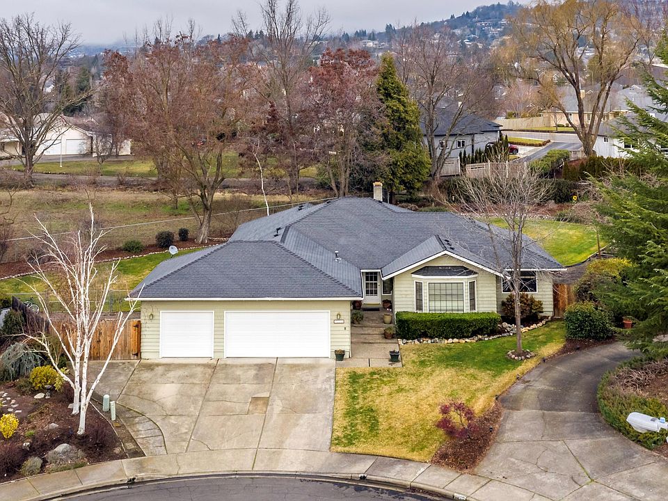 This Gracious 4 bedroom, 2.5 bath, single level home has everything you are looking for!! 3 car garage plus Gated RV parking. .41-acre lot with expansive views and Rogue Valley Country Club frontage. Large open kitchen and family room, with a brick surround fireplace. The kitchen is large with an island, eating bar, built-in desk, expansive cabinetry and countertops. Open living/kitchen area has direct access to the large, covered patio overlooking an amazing backyard oasis with garden beds, and no neighbors in the back! Large dining area opens to the kitchen and the vaulted, beamed ceilings in the large living room. Hardwood floors, new garage doors and gutter system. Located on a quiet cul-de-sac in the Hoover, Hedrick, South Medford district and just minutes to shopping, RV Regional Medical Center and I-5 access. Don't miss this magical house!
