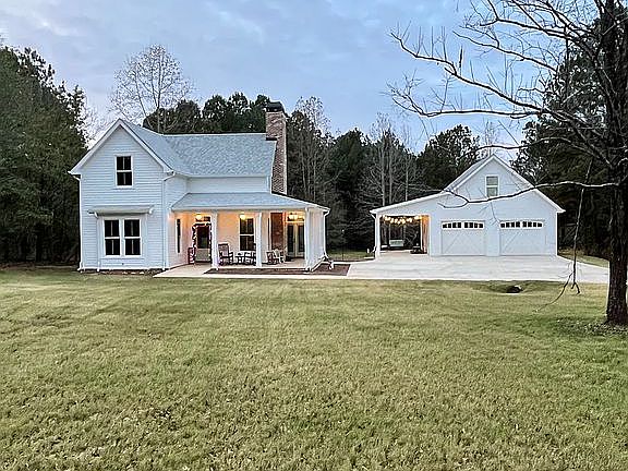 Southern living house on a little over five acres. Detached garage with bathroom and upstairs room. 4 bedrooms inside with 2 and 1/2 baths. Two living rooms. Hardwood floors throughout. Two covered porches.