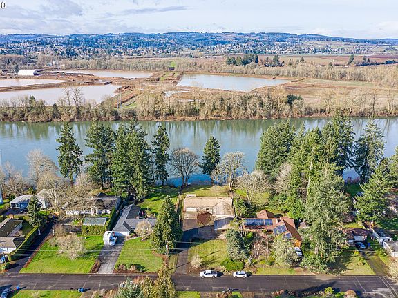 One-level Duplex in quiet neighborhood by the river and near community park. Large lot with Willamette River frontage and access! Two homes, each featuring separate entry, full kitchen, living and family rooms, 2 beds, 2 baths, laundry and 2-car garage. Live in one home while earning rental income or enjoy multi-generational living. Lot can be divided (buyer to do due diligence). RV parking and disposal. Property line extends to water- opportunity for a boat ramp and dock!