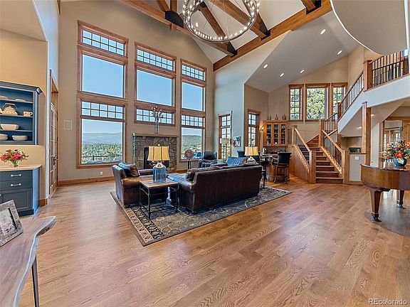 The beauty of post & beam construction and creative architecture makes this Colorado home a work of art. Abundant natural light from perfectly placed windows showcase the sweeping views of our Rocky Mountains. High end designer finishes are found throughout this recently remodeled & immaculately maintained estate. Gated and private with over 8 acres, this property enjoys an excellent north Evergreen location for ease of access to Denver and the I-70 Resorts. The impressive foyer opens to the great room, spacious new kitchen, dining alcove with breath-taking views, the elegant dining room, butler's pantry, & an intimate library. The main floor suite is completely perfect with a fireplace reading niche, balcony, & an ideal bath that will meet all expectations. Every desirable detail & upgrade is featured in this home: classy elevator to all 3 floors, all bedrooms en-suite, in-floor heat, air conditioning, media room, wine room, safe room, hobby room, 3 wet bars, and so much more.