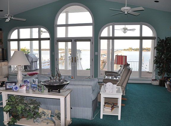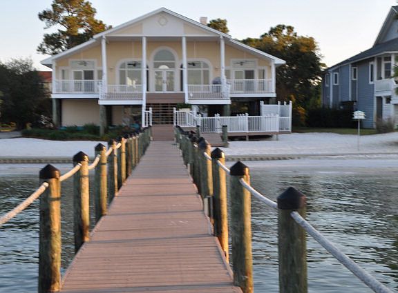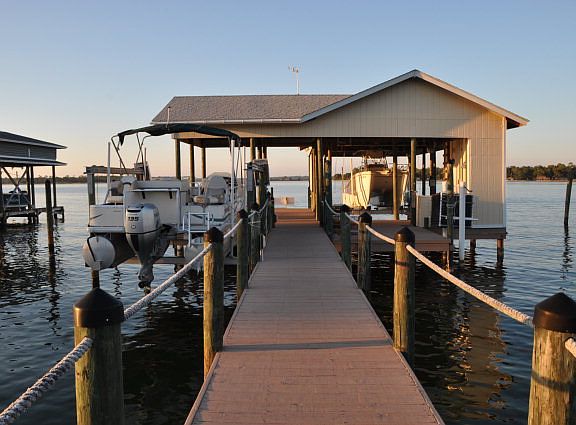Caribbean style island home with Wide porches and large windows that provide light and beautiful panoramic views. Comfortable and charming. A great House!Covered boat house with 3 lifts and a Pier that can accommodate dockage for a 60 ft. yacht. This property has white sandy beaches and shallow water for swimming, but then you have at the end of a short pier 10 to 12 feet of water.