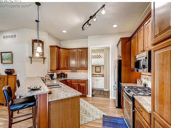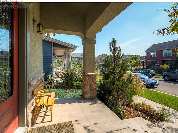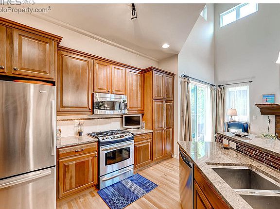 Main level master! Lives like single fam home. HOA takes care of ext maint, fr. landscaping, snow removal. Terrific curb appeal w/covered porch, stain glass entrance. Once a model, this home is in perfect cond. Loaded with upgrades incl beautiful cherry flrs, elegant cherry cabinets, slab granite, SS appliances. Vaulted and 10 ft ceilings Great Room w/gas fp. Flatiron views from upstairs bedroom/office. Lower level fin except carpet, ask about roughed in bath piping behind walls.