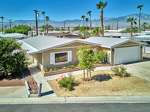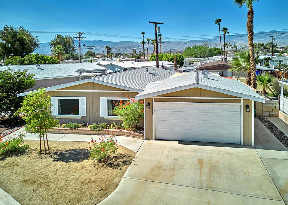 Looking for a great spot in the desert? Check out this freshly remodeled, move-in-ready home in Tri Palm Estates & Country Club--an active 55+ community where you actually own the land! This 2-bedroom, 2-bath home sits on a PERMANENT FOUNDATION WITH 433A CERTIFICATION, which means financing is a breeze.Step inside and you'll find an open, airy floorplan with stylish luxury vinyl plank floors, fresh paint, and new trim throughout. The kitchen is newly updated--cabinetry, quartz counters, shiny appliances, and modern fixtures--so you're all set for cooking and entertaining. There's also a private covered patio for relaxing outside, plus a powered workshop for projects or extra storage.Living here means unlimited free golf on both an 18-hole course and a 9-hole par-3, a putting green, swimming pools, spas, tennis, pickleball, shuffleboard, basketball, and a clubhouse loaded with a banquet room, bar, restaurant, billiards, and lots of clubs and activities.You're super close to all your essentials--Costco, Sam's Club, Home Depot, Lowe's, Walmart--and fun spots like Agua Caliente Casino, Eisenhower medical campus, and Acrisure Arena for hockey and concerts. With quick access to I-10, it's just minutes to Palm Desert, Rancho Mirage, and downtown Palm Springs.This is the perfect place for anyone wanting a fun, easygoing desert lifestyle!