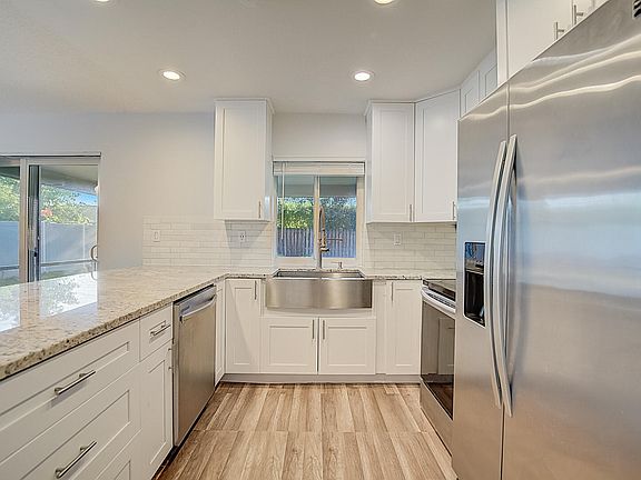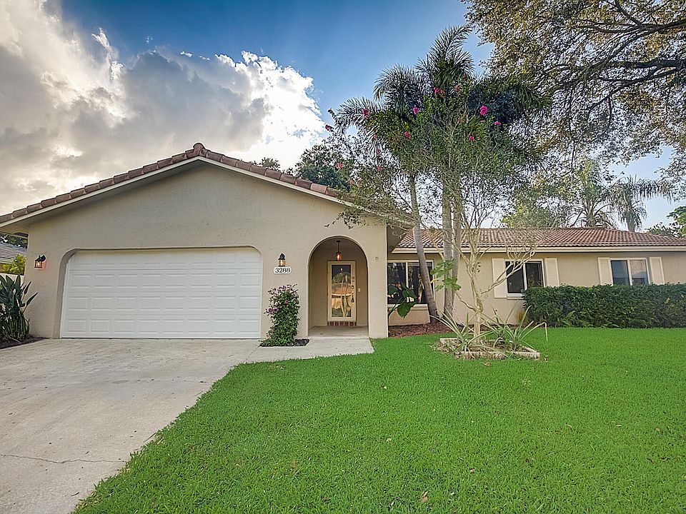 This Boca Raton one-story home offers a patio, granite countertops, and a two-car garage.