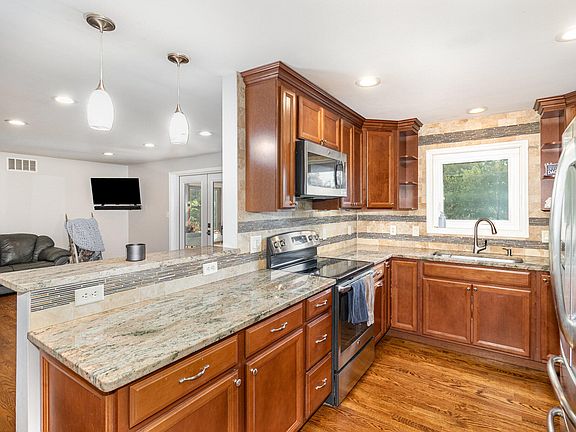 Beautiful 4- 5 bedroom, 3-full-bath ranch on over a half acre. Hardwood floors, fireplace, and granite throughout. Finished walkout basement with wet bar leads to a saltwater inground pool, courtyard, and patio. Enjoy the 3-season room overlooking the backyard. Major updates include: roof (2022), new insulated garage door (2022), pool pump (2022), new windows and skylights (2023), concrete patio/retaining wall/steps (2023), gutters/downspouts/fascia wrap (2024), and driveway (2021). Move-in ready with style and peace of mind