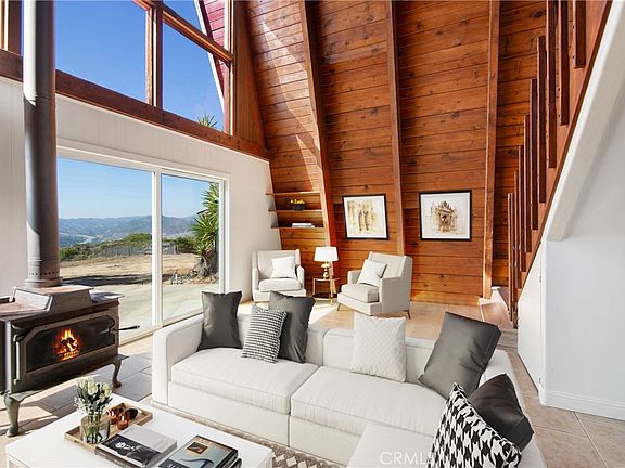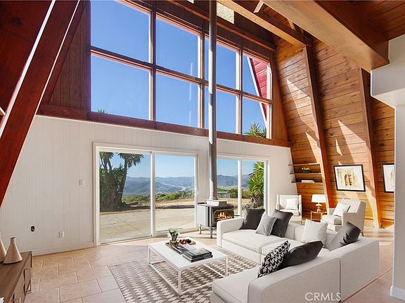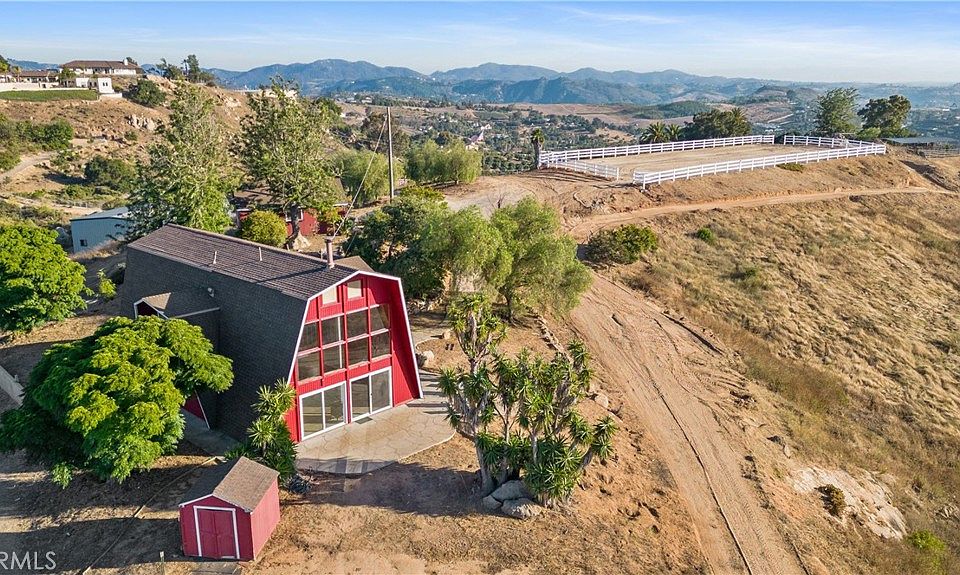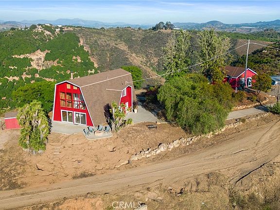 Views, Views, Views! Live on Top of the World in Bonsall, CA. This unique one-of-a-kind farm with roughly 20 acres is positioned perfectly on top of a mountain with 360' views of the ocean, mountains, valleys and rolling hills. The main home has an A-frame cabin design with windows from top to bottom. The charm of this home makes every day feel like you live on your own excluded mountain top. The interior provides a light & bright open floor plan with a main floor master bedroom, walk-in closet, remodeled bathrooms, entertainer's kitchen, family room, dining room, tall ceilings, 2 bedrooms upstairs, oversized loft, walk-in laundry, Dutch door and sliding glass doors to 3 patios. The exterior of the home has recently been painted a pretty barn red color. There is a detached guest house only steps from the main house and is a blank canvas ready to be finished as an ADU or hobby room. The guest house was virtuality staged to give ideas on how to layout the interior space. Garage/Metal Building is huge and is roughly 60'x40' with electric. Horse lovers, this property is for you and comes with a fenced in arena and covered stalls. Once passing the private motorized gate you will see the vision of the land and the beautiful treed driveway leading to the main home and guest house. The land has been cleared to provide options for other structures or land use. This is a must see home and will not disappoint.