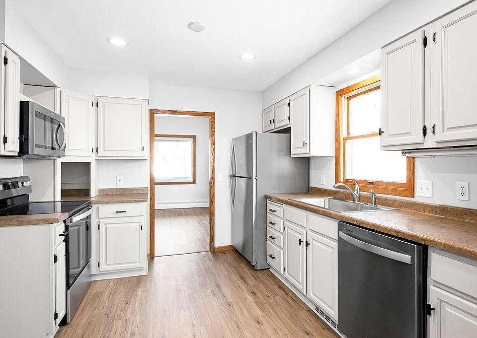 Beautifully updated 2 story home on large lot in town. This renovated home features main floor bedroom, 3/4 bath, and family room with in-floor heat. Updated kitchen and dining area and two separated living room/office areas. Walkout from here to covered porch that spans the front of the home. The upper level has three bdrms and a full bath with double sink vanity. Clean basement with utilities, laundry tub, and laundry hook ups - freshly painted walls and floor give the basement an open and clean look, great for storage! Detached, 2 stall garage is insulated and could be finished; paved driveway and fenced backyard. New updates to the home include: New carpet throughout the main and upper level. New flooring in the kitchen and dining area. New stainless steel Whirlpool kitchen appliances, farmhouse sink, painted cabinets with modern hardware. New vanities in lower level 3/4 bath and upper level full bath. Cedar siding that was re-stained in March. Minutes from I-35 for easy commuting!
