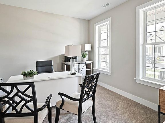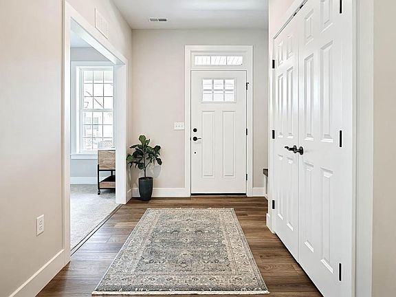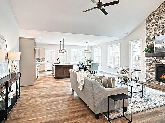 This charming 1-story home with welcoming front porch includes 9’ ceilings and a 2-car garage. Stylish vinyl plank flooring in the foyer extends to the main living areas. The kitchen, featuring quartz countertops with tile backsplash, stainless-steel appliances and large center island, opens to a sunny dining area with access to the rear patio. The spacious living room boasts a cathedral ceiling and a gas fireplace with stone surround and box beam mantel. A carpeted flex space to the front of the home can be used as a home office. Tucked to the back of the home is a large owner’s suite with an coopexpansive closet and a private bathroom with a 5’ tile shower and double bowl vanity. Across the hall from the suite is a guest bedroom and full bathroom. An unfinished storage area on the second floor makes storage a breeze!