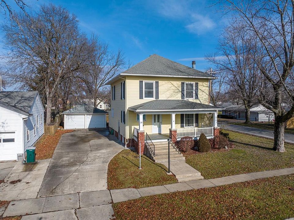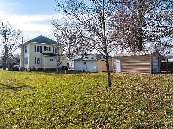 Two story move in ready home, 4 bed, 2 bath on corner lot with paved driveway. Well maintained with hardwood floors and wood burning fireplace on main level. Plenty of space for hobbies in the basement which includes a pellet stove as an extra heat source. Two detached garages provide plenty of storage space. Patio out back door, alley at back of lot for easy access.