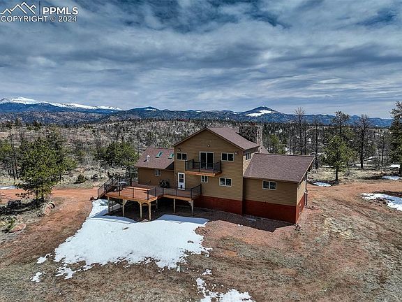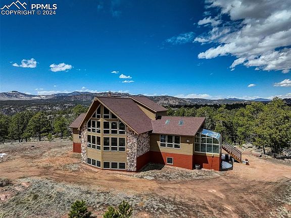 Discover Your Dream Mountain Oasis: Nestled amidst the serene landscape of Florissant, Colorado, this stunning 6-bed, 3-bath house offers an unparalleled living experience for those seeking comfort, luxury and breathtaking natural beauty. Spanning an impressive 4,896 square feet on a sprawling 35-acre lot, this property presents a timeless architecture complemented by modern luxuries and captivating mountain vistas. Enter a world where each detail is expertly crafted for aesthetic appeal and functionality. The heart of this home is its expansive kitchen, designed to delight any culinary enthusiast with ample space for dining and an attached sunroom, perfect for enjoying morning coffees with a view. The Great Room invites awe with its soaring beamed ceilings, floor-to-ceiling windows with abundant natural light and a striking stone fireplace. The primary suite occupying the entire upper level is a haven of tranquility. It features a private balcony offering scenic views, a spa tub, a standalone shower and a generous walk-in closet. The main floor is home to three more bedrooms, each spacious and inviting, and a bathroom with a double vanity with granite countertops. The walkout basement is a hub of entertainment, boasting a grand family room with another stone fireplace, a spacious recreation room, 2 bedrooms, one previously used as a media room, and ample storage space. Radiant heated tile flooring throughout the main floor and electric baseboard units in other areas ensure comfort throughout seasons. Step outside to the deck or balcony to appreciate this property's location — breathtaking views of the mountains, trees and rock formations. There is even a seasonal creek gracing the landscape. Featuring a newer roof, deck, balcony, boiler and PEX piping. With a very spacious, detached garage and a cell phone booster for connectivity, this property ensures your needs are met. Discover your dream mountain retreat here, where every day feels like an escape to paradise.