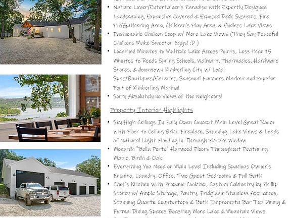 The shop, the house, the view! We're talking about two acres of panoramic, main channel water view, no restrictions, 80x40 shop, chicken coop & the most exquisite private four bedroom (plus two more non-conforming*no window*), four bath estate! Lake days, sun-rays & sweet sweet serenity is all you will have from here on out! Prepare to be completely mesmerized by the eagles soaring down the natural wind tunnels of the mighty & pristine main channel of Table Rock Lake, the glisten of the lake bouncing off your cheeks & roar of fishing boats taking off for the morning tournament. It's magical! The fresh lake air will put you in a mood that can't be explained. The inside deets: Floor to ceiling windows will greet you flooding in that awesome view & warm natural light throughout the open kitchen to living floor plan, there is a fireplace & grand entertaining spaces throughout, expansive partially covered deck system, a massive workout room, incredible Karastan wide plank hardwood flooring w/ a mix of birch, maple, & oak woods, a chef's kitchen that will delight even the most attuned master chef, complete w/pantry, double oven, beverage fridge, coffee bar, commercial grade fridge, gas cooktop, Quartz counters & custom cabinetry. The owners suite is completely separate from the other bedrooms & big enough to play basketball in, w/its very own living area & spa-like ensuite w/jacuzzi tub, walk-in tiled shower & gigantic walk-in closet. The home & shop have been fully insulated w/spray foam & sided w/Diamond Kote siding for beauty, longevity & efficiency. Steps from the home is a 80x40 shop building, w/electric,***20ft of the shop is 45ft deep & features a 16' door(great for the RV), two 10' doors, and two 8' doors, a 20x40 loft and so much more! Bonus: there is an offering of a 12x30 boat slip (3rd party, additional $$) just a short drive from the house. Come see what it's like to own the best seats in the house on Table Rock Lake@329 Indian Valley Rd!