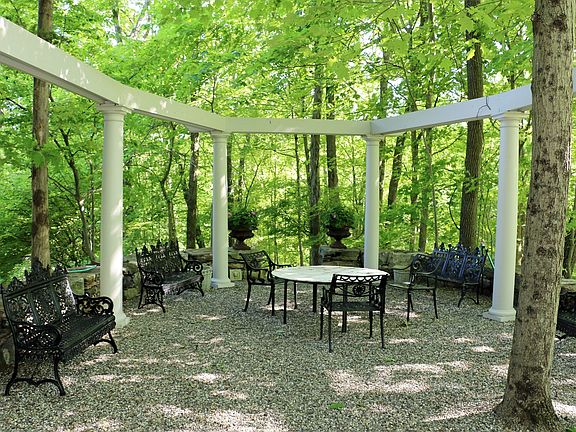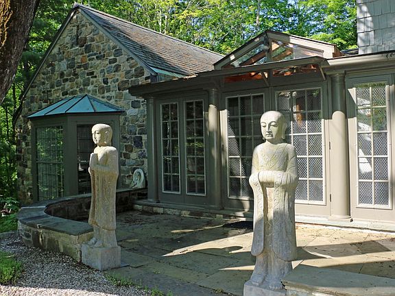 "SKY ROCK" -Stunning, one of a kind, 1939 vintage cut stone and cedar shingle home with dramatic 4 story custom glass tower offering panoramic views of the surrounding private 9.67 acres with 2 ponds and extensive professional landscaping including 1 mile of interior roads and walking trails. Like your own private retreat with multiple stone terraces; custom Belvedere set near the house at the highest point for commanding views; cast iron gazebo for pond side parties; and adjacent to Seth Low Pierrepont State Park with 300+ acres and further opportunities for hiking, fishing, and non-motorized water sports; yet all just approximately 1 hour to New York. The home is an architectural masterpiece, designed by the late Manhattan architect Leigh H. French, Jr. for Mr. and Mrs. John P. Duncan, grandson of John Duncan's Sons, Agents New York, the original importer of Lea & Perrins Worcestershire Sauce in 1839 which became the best selling condiment in the USA. In addition to the slate and copper roof, this quintessential Connecticut country estate offers 4,238 square feet, 4-5 bedrooms, main floor master bedroom suite suite, 4 and 1/2 baths, and 4 fireplaces including the double sided fireplace serving the master bedroom and adjacent exterior stone patio. Most impressive stair tower extending from the hand cut field stone lower entry, through the second and third stories, to the phenomenal tower observatory with beamed and vaulted timbered ceiling and walls of windows. Owned and adored by the current owners since 1976, this special home has been continuously maintained and improved reflecting true pride of ownership.