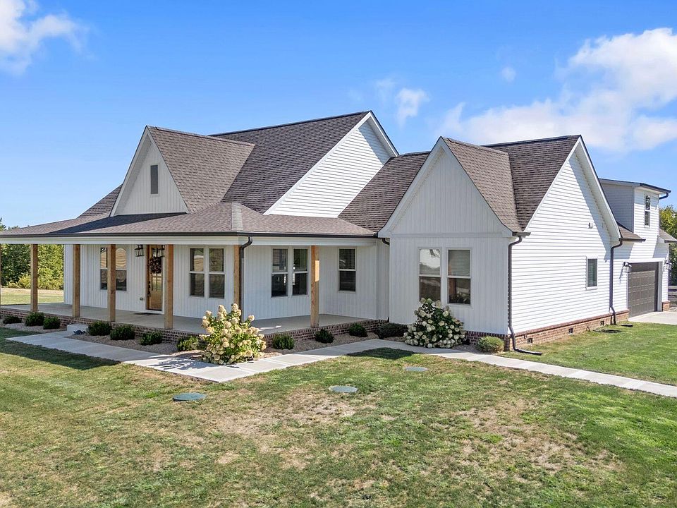 Built in 2023, this stunning modern farmhouse sits on just over 5 acres with new landscaping, horse plank fencing, and wildflowers that brighten the land each spring. A wrap-around covered front porch frames peaceful views of farmland and trees, offering a quiet retreat with timeless curb appeal. Step inside to the great room, where detailed ceilings, an impressive ventless gas fireplace, and custom built-ins create a welcoming centerpiece for the home. The open floor plan flows seamlessly into the gourmet kitchen, featuring custom wood cabinetry, quartz countertops, a tiled backsplash, a huge island, and a spacious dining area. A gas cooktop range with vent hood completes this chef's dream space. The first floor primary suite is a private haven with a luxurious ensuite bath offering spacious double vanities, a freestanding soaking tub, a large walk-in tile shower, and a massive walk-in closet with custom wood shelving. Two additional bedrooms, a full bath, a home office, and a hallway half bath are also located on the main level. Upstairs, a fourth bedroom or flexible bonus room includes its own full ensuite bathroom. The HOA takes care of a tranquil community pond and pavilion. This home is the perfect blend of modern comfort and peaceful country living. Not in a flood plain and never any water issues.