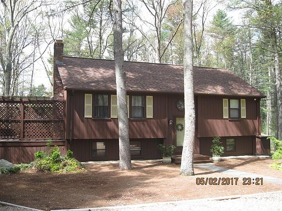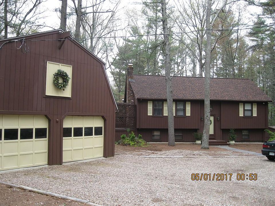 Contemporary Split Entry set off the road in the Pines. Cathedral ceilings, hardwood floors, built-in bookcases and granite counter tops, central air, stainless steel appliances are some of the extras in this home. 2 fireplaces. Lower level features third bedroom, full bathroom and front to back family room. Over sized detached 2 car garage with door openers and large bonus room above complete with 8 ft pool table. Roof is architect shingles only 1 year old. Title 5 approved. Seller can accommodate a quick closing.