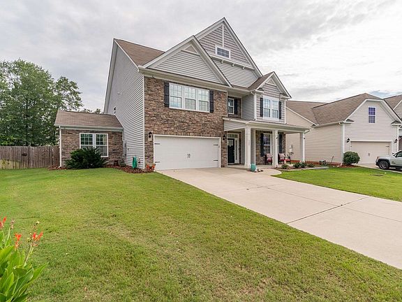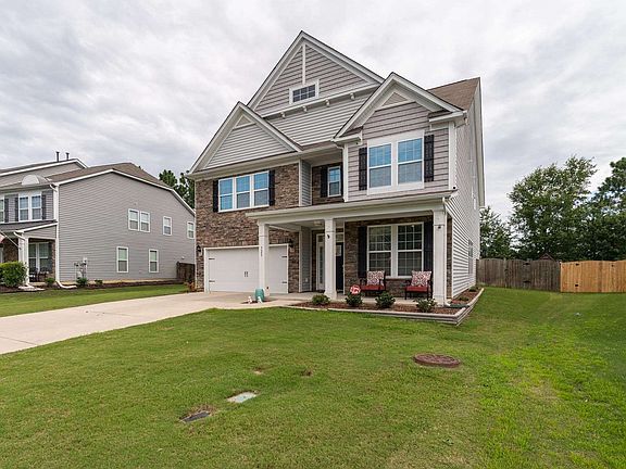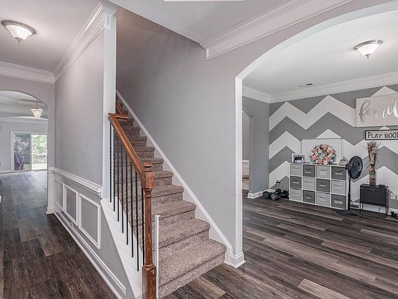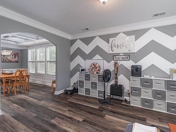 This show stopping, dream home will check every box on your list! Enjoy gorgeous sunrises and sunsets on your covered front porch! Upon entry you are greeted by your formal living room with crown molding, adorable statement accent wall and gleaming laminate floors that flow throughout the main traffic areas of the home. The formal dining room offers crown molding, chair rail, a coffered ceiling, beautiful chandeliers and arched doorways with beautiful custom ceiling details that add so much character. A dream kitchen with white and bright 42 inch cabinets, large island, walk-in pantry,granite,subway tiled backsplash, stainless steel appliances and matching stainless steel vent hood that ties the whole room together. Views into your spacious, naturally bright great room with crown molding, cozy carpeting, gas fireplace and an upgraded 9 blade ceiling room on main level off of the garage entry with catch-all area for book bags etc. Dual masters, both offering private bathrooms, sitting areas and walk in closets, perfect for the King/Queen of the house and the In-laws!!Two bedrooms with a Jack and Jill bathroom on one side, and the 5th bedroom has a bathroom that is shared with the hallway. Nice size laundry upstairs, washer and dryer negotiable with offer. There are 7 closed circuit cameras with night vision, motion detection,DVR and smart service agreement. Flat, fully fenced backyard with back patio, shed, and swing set! Community pool, gym and playground!