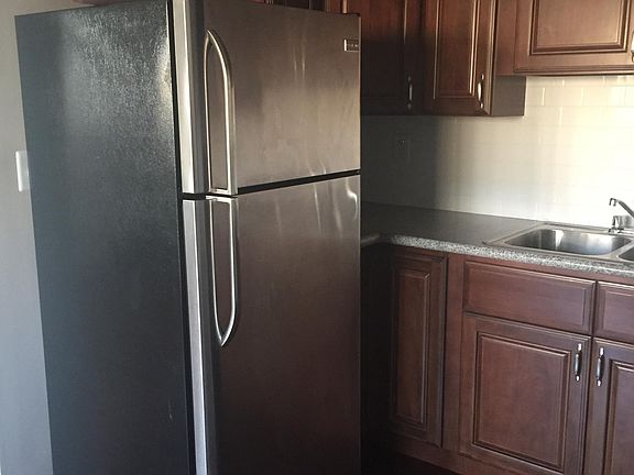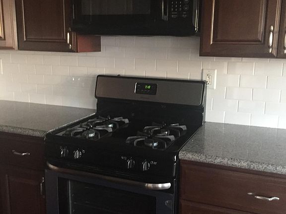 Stainless steel appliances include, stove, refrigerator and microwave.