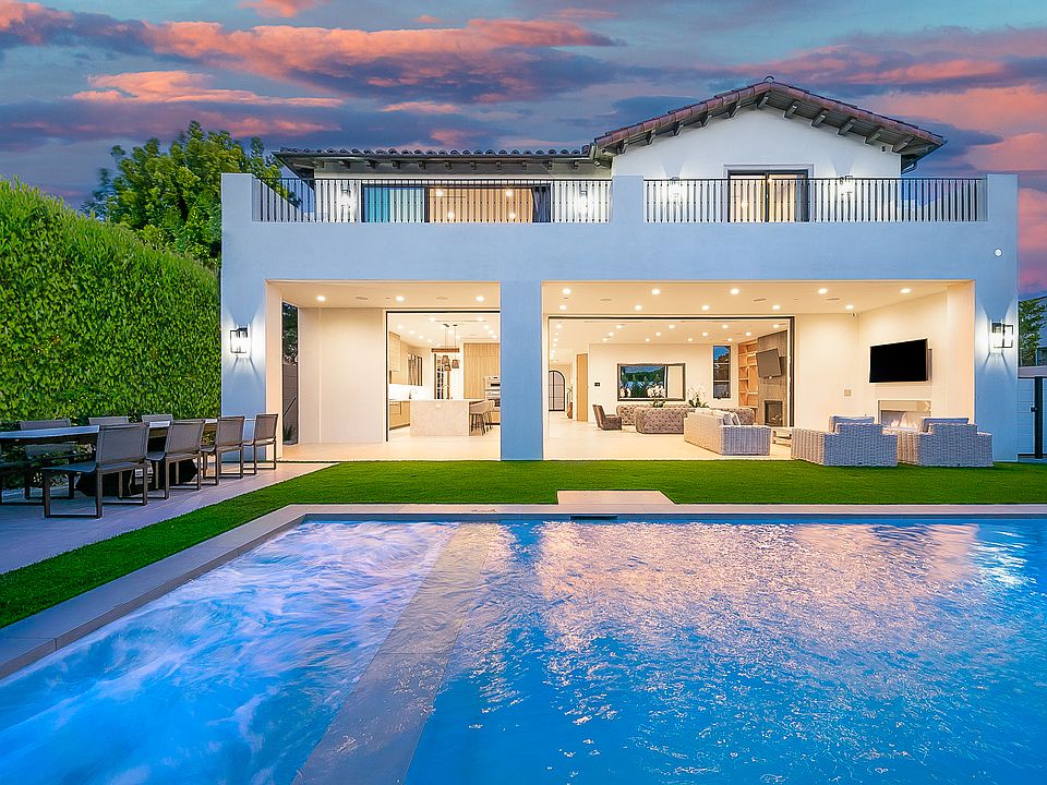 Contemporary Mediterranean Villa in the heart of Beverly Hills! This new construction gem with top of the line finishes is located in prime Beverly Hills near fine dining, shopping and entertainment. It features bright open floor plan, high ceilings, grand entry way, formal living room with fireplace, built-ins and dining room, California style indoor-outdoor living, chef's kitchen with center island, top of the line built-in appliances, spacious 5 bedrooms and 5 and a half luxurious bathrooms, huge master bedroom with high ceilings, fireplace, massive balcony overlooking the back yard with pool and spa, walk-in closet, luxurious master bathroom with soak-in tub and walk-in rain shower. Family room with fireplace that opens up to private entertainer's back yard with large covered patio with fireplace, TV and outdoor furniture, sparkling pool, spa and outdoor built-in kitchen with BBQ. 2-car carport and long gated driveway Available for Long Term Rentals and/or Short Term Rentals.