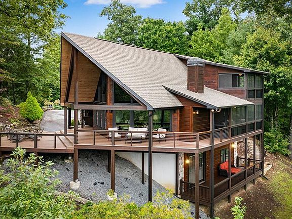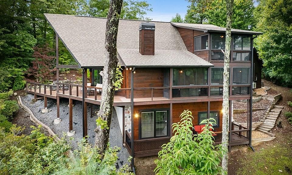 Welcome to a rare gem in the prestigious Mountain Tops community, just minutes from downtown Blue Ridge yet offering the peace and privacy of true mountain living. This designer mountain retreat combines modern sophistication with rustic charm, featuring breathtaking long-range views and year-round sunrise vistas. Step inside to discover high-end finishes, rich wood textures, and three fireplaces—gas, electric, and wood-burning—creating warmth and ambiance throughout. The open-concept layout flows effortlessly to a screened-in porch with invisible screens and vinyl windows, offering a four-season space for relaxing or entertaining. Designed for low maintenance and high style, the home boasts Trex decking, professional landscaping, and a custom stone retaining wall. Enjoy comfort year-round with a dual-energy HVAC system equipped with a built-in humidifier and dehumidifier. The detached two-car garage has been thoughtfully converted into an entertainment retreat, perfect for movie nights or gatherings. With its unbeatable location, panoramic views, and timeless design, this home offers the ultimate Blue Ridge lifestyle—ideal for a full-time residence or luxurious mountain getaway.
