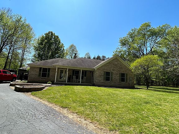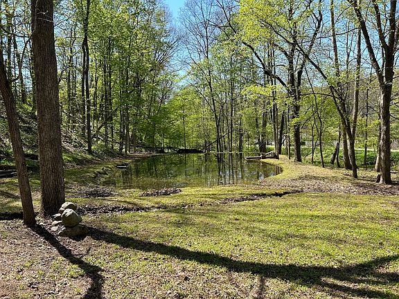 This beautiful 3 bedroom 2 bath brick home on a hill offers 2 acres of beautiful woods and feels like living in a park. Features include a large Great Room with fireplace, nicely sized eat-in kitchen with appliances, a primary bedroom with a full bathroom, a giant rec room with an 'outhouse', a bar and a wood burning stove. Other features include a very large (54'X30') garage/barn with an office area and multiple overhead doors. The building has a separate electric meter or it can run from a sub panel. The building also has an attached chicken coop. There is also a picnic shelter & a pond on the property. The owner has seen deer, owls, woodpeckers, turtles, etc. on the property (see pictures). **Please excuse clutter as owner is purging