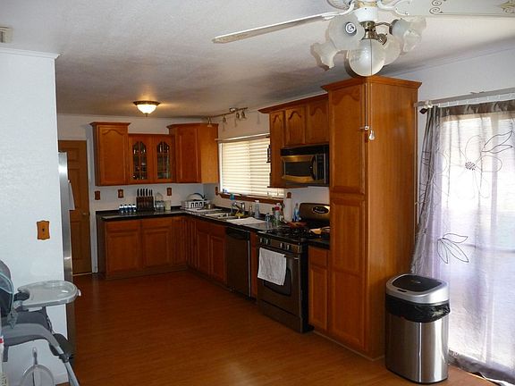 Great NW location! As you drive up you will notice the landscaped front yard & mature trees. The stained glass door greets you as you enter. The living room with its laminate floors & rock fireplace is a large gathering place for family and friends. Continue on to the dining room and remodeled kitchen, also with laminate floors. Large family kitchen has cabinets with rollout drawers, granite tile counters, stainless/black microwave, range & trash compactor. As you turn down the hall you will see four bedrooms & 1.75 baths. One of the bedrooms is also accessible from the living room and would make a great office with a view of the fireplace. A MasterCool, garage with rollup door/auto-opener/ cabinets complete the picture. Some of the windows have been replaced with dual panes. Oh yes, the backyardâEUR¦it is huge with a patio and block wall.