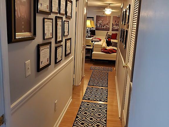 2 bedroom, 1 bath Condominium in the Shadow Moss apartment homes complex. It's located in downtown Lexington SC. The Living, Dining, and Hall has Honey Oak engineered flooring, with baseboard, wainscoting, and chairrail. The walls are light gray with a burgundy accent wall in the living area and dining area. The ceilings are white textured. The bedrooms are carpeted. The bathroom has white tile wall and floor tile and a built in vanity and wall cabinet. The kitchen is a galley style with white painted epoxy cabinets, light gray lvt slat floor, laminate counter tops, and large pantry with built in shelving. There is a balcony with outside storage off the Living Area. The community has an on site laundry facility and provides two parking spaces per unit. Shadow Moss does not allow pets.