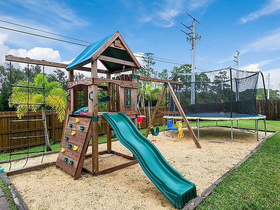 Beautiful, immaculate 4 bedroom, 2 bathroom home in gated community. This fabulous home has a salt water pool with color changing lighting. Please look at the photo's to get the full impact of the outdoor patio and screened pool. There is a Children's dream encompassed in the fully fenced yard. The stack stone on the front of the home give it individuality. New tasteful vanities in both bathrooms. Fully equipped kitchen with stainless appliances and granite counters.The community itself has basketball and a playground.Ideal location for school's and all amenities. 2 car garage. Manual storm shutters. This home is absolutely lovely. A must see!!!!