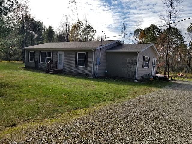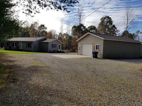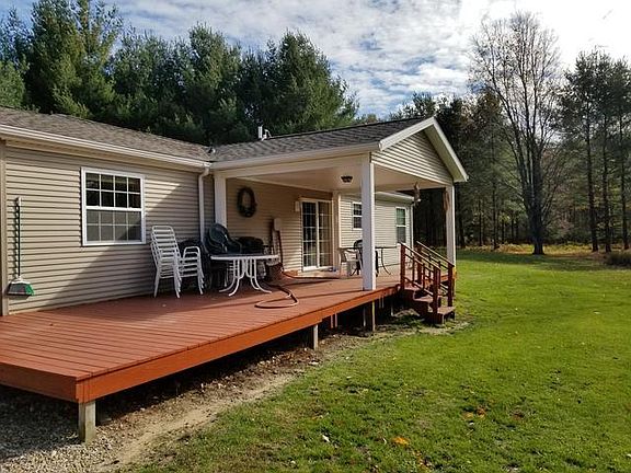 10 acres partially wooded, upgraded package for home includes roof pitch, insulation, all dry walled interior. Newer air condition, new carpet, 4 new window on east side, new additional decking and covered roof. Pole barn is 24x32 detached with some insulation and wood walled interior. Including appliances