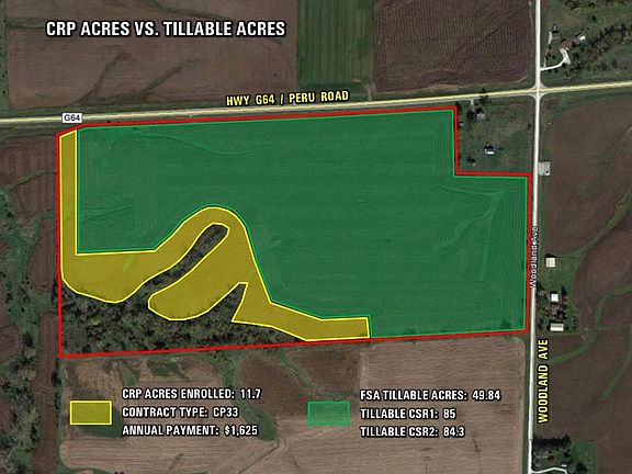 High quality farm in strong area. 74.35 acres m/l of Madison County farmland available consisting of 49.84 FSA tillable aces with a CSR of 85 (CSR2 of 84.3.) Primary soil types include Macksburg and Nira silty clay loam with approximately 78% of the land carrying a CSR of 88 or greater. Farm also includes 11.69 acres enrolled in CRP with an annual payment of $1,625 and expiring in 2019. CRP contract type is CP-33 Habitat Buffer for Upland Birds. Contact Agent for details regarding Conservation Plan. Farm is located on a hard surface with rural water and electric along the road. There is an 8 inch water line along west side of Woodland Avenue. Several great building sites for your home and abundant wildlife with great cover from the CRP and timber in the southwest corner of the property. Located less than two miles from Interstate 35 and less than 30 minutes from the Des Moines Metro. Farm is situated on the south side of Hwy G64 / Peru Road in Section 11 of Ohio Township.