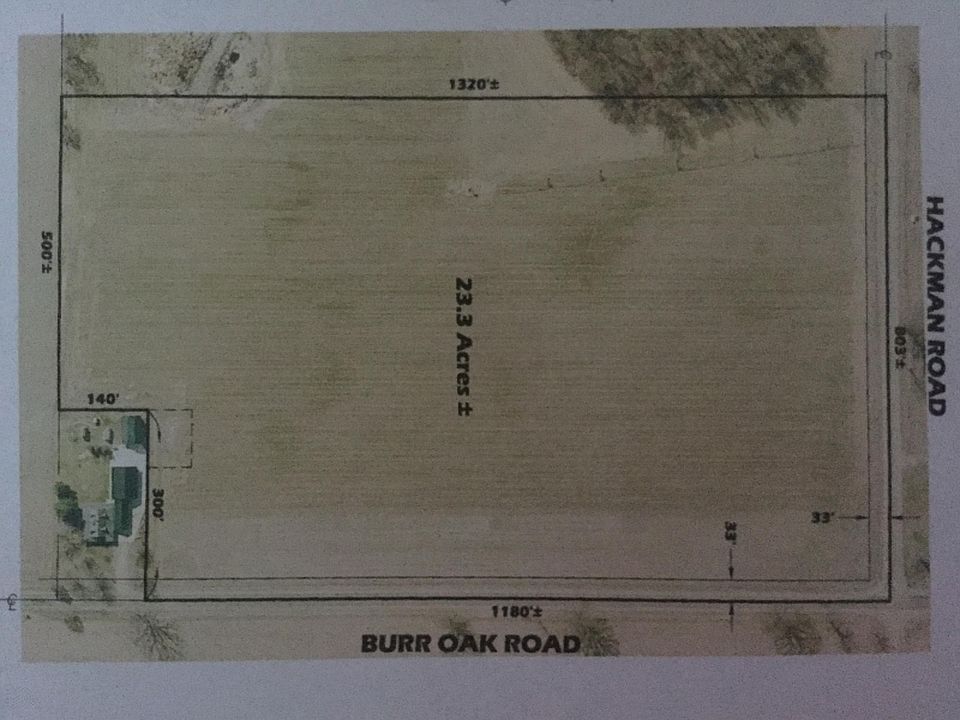 23.321 acres, mainly tillable, in Burr Oak area, that would make an awesome building site or just a great investment . Farmland is being leased through 2019 for $200.00 and acre. Lots of road frontage, hard to come by in this location. Nice flat ground with pivot. Pivot and all equipment can be bought separately from leasee. Irrigation water is from Neighboring farmers pond. Lot dimension and acreage amount are approximate. Street number is generic for directional purposes only. New stake survey in 2019.