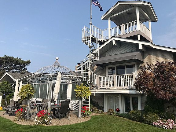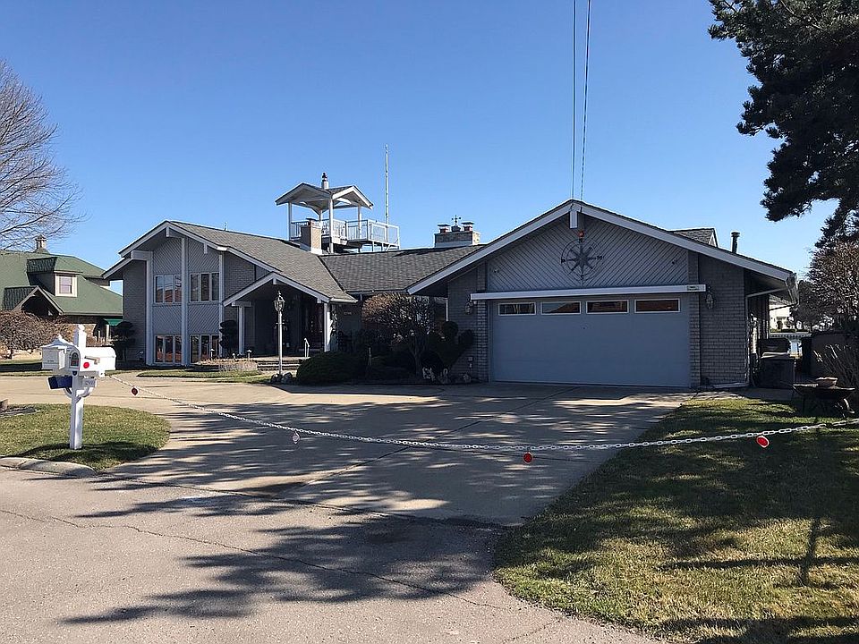 Tri level with 110 ft frontage on deep water Clinton River with two 50' and one 37' boat wells. View of lake St. Clari from Front windows and 40 miles of it from the observation deck. On Private Road shared with 11 homes.