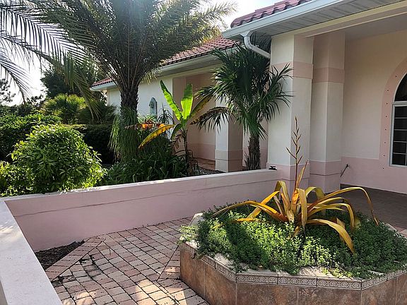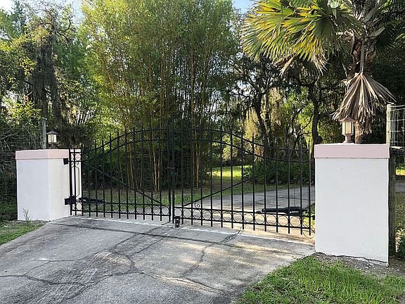 This is a large very private Single-story pool home with a tile roof of concrete block construction. It is 5398 ft.² of air conditioned living space with an additional 683 ft.² of porches and 601 ft.² of double car garage with additional storage. Two outbuildings house storage space and the pump house. There is a very large (1152 square foot) pool deep enough for diving set in a 1 1/2 story pool cage with very large tiled pool deck and spa with a swim up bar and in pool seating. There are four full bedrooms with a large attached room with private bathroom off the master suite that can be used as an additional bedroom (ideal for small children) or office or exercise room. There is an attached redwood sauna. The Master Suite is a very large bedroom with marble tiled master bath, double vanities, tub, shower, toilet, bidet, large walk in closet and planted privacy enclosure off the tub area. There are three additional bedrooms. There is a large formal living room, formal dining area, large family room with large fireplace and bar, and a glass enclosed media room. The open concept kitchen has granite counter tops and back splash, and seating for seven to nine stools at an eat in counter top. There is an area for a table just off the kitchen. The kitchen has cherry wood cabinets, an induction cooktop, double ovens, microwave/ oven combination, dishwasher, separate refrigerator and freezer, double sink, and lots of storage. There is a separate laundry room with washer, dryer, cabinets, rinse sink, built in ironing board, and broom closet with storage. The home is very spacious with 14 foot ceilings throughout, ceiling fans, sky lights, and chandeliers. Air conditioning is zoned with three units. All recently replaced. There is a monitored alarm system and dual water heaters. There is an electronic security gate and eight foot sold lock high tensile strength fence surrounding almost 10 acres and concrete driveway. The fence was built for use with deer, antelope, bison, or domestic animals. There is additional internal fencing that was built to be electrified if desired. The landscaping is mature with several large bamboo of various species,palms, native oaks, and long leaf pine. Much of the property has been left in a natural state to provide privacy and a home for wild life. The property is 22 feet above sea level, a place we go to rather than from in bad weather. No flood insurance yet close to creeks for canoeing and fishing and observing Florida’s abundant wildlife. If you love your privacy and want to connect with nature and others on your own terms while living in a beautiful home this is a property you should consider.