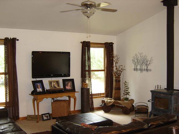Beautiful 4 bedroom ranch home on a quiet wooded 1.5 acre lot in a rural subdivision. Stone/wood exterior, blacktop driveway to attached 2 car garage. Kitchen features breakfast nook with steeple roof. 3 bedrooms on main level, master bedroom has whirlpool bath. Woodstove in living room keeps it warm and cozy. Home has geothermal heat pump that keeps heating and cooling costs very low. Very nice property, must see! Seller is willing to negotiate on washer, dryer, and electric fireplace in basement.