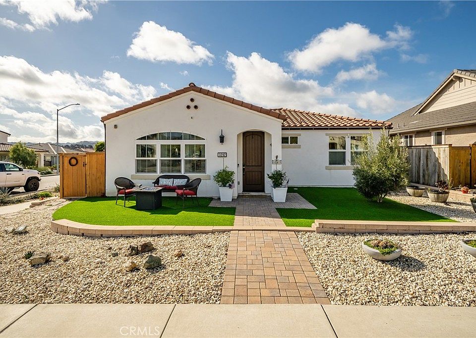 Spanish Mission Revival inspired residence in the highly desirable Serra Meadows community! Nestled amongst the picturesque setting of the South Hills open space, this special enclave of homes enjoys awe inspiring views, unparalleled access to tranquil hiking trails, dining and shopping in the SLO Public Market, and convenient access to US 101. With three spacious bedrooms and two luxuriously appointed bathrooms, this single level floor plan is situated on a corner lot and perfectly suited for living the quintessential San Luis Obispo lifestyle. Stepping into the entry, you are greeted with upscale finishes such as luxury vinyl plank flooring throughout most of the home, smooth trowel finished walls, 9’ ceilings, dimmable recessed LED lighting and window coverings. The living room, with a cozy gas fireplace with wood mantel and hearth, is a comfortable space to unwind after a day of wine tasting Edna Valley or kayaking in Morro Bay. The social hub of the house, the kitchen is an entertainers dream with granite slab countertops, GE and Kenmore appliances (refrigerator included), an expansive island with breakfast bar, and premium cabinetry with pull out shelving and a mixer/appliance lift, and the adjacent dining room with an 8’ dual sliding glass door is the perfect place to gather around the table with family. Your own private retreat, the owner’s suite features a walk-in closet, and a luxe bathroom with dual sinks, granite countertops, and a walk-in shower with a frameless glass enclosure and a tiled surround. With two secondary bedrooms, each with adjustable closet organizers, located adjacent to a full bathroom with an extra deep bathtub, your out-of-town guests will always feel right at home. Complete with a stamped concrete patio, a lighted portico with solar shade, and low maintenance landscaping with citrus and bougainvillea accents the rear yard is the ultimate outdoor living space for enjoying a weekend BBQ with friends. With an abundance of cabinet storage as well as a utility sink, the laundry room is a functional space that will help you stay organized. The alley loaded two-car garage will give you plenty of room for storing surfboards and mountain bikes after a fun day of exploring the Central Coast or completing home improvement projects. Additional hi-lights include a tankless hot water heater, window AC units, and synthetic turf in the front yard. Don’t miss this wonderful opportunity to call 3292 Violet Street home!