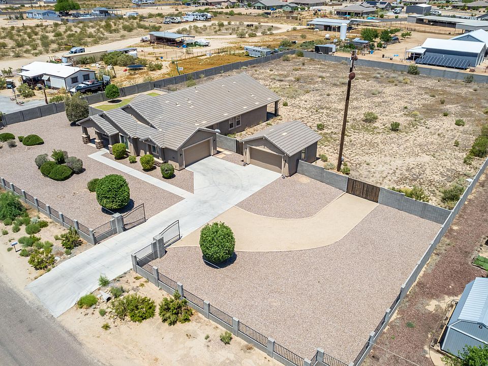 Gorgeous 4 bedroom home with sewer connection, no HOA & almost 1.5 acres with block wall & all around mountain views. The HVAC is new. There's under eaves permanent holiday lights -cool! Private gated entry with 2 separate garages. The attached garage is extended. Also-Front porch, gravel driveway to RV gate, a grassy, fenced side yard, long cov. patio & loads of extra land. The interior has 2 living spaces w/shutters on front windows & big dining area . The kitchen features a pantry, island, B bar, granite counters, Koehler sink & plumbed for pot filler. The primary suite is split with a massive closet & linen area. Two other bedrooms have walk in closets. There's a wide hall linen closet & front coat closet. Great laundry with lots of cabinets, sink & counter. See full Features List.