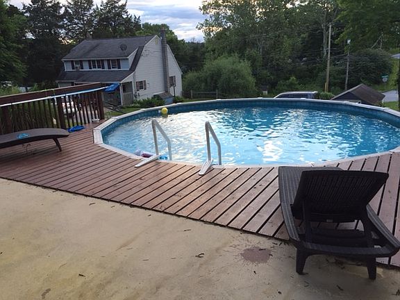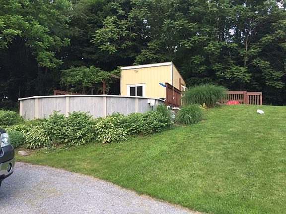 Cozy 4 bed, 2 bath Colonial home on a .69 acre lot. . This home features: a Circular Driveway with a lot of parking, a spacious backyard with above ground pool, pool house and deck. There is a detached one car garage, and a front two tiered deck, as well as a covered back patio. The inside of the home features an Open living and dining room, kitchen with recessed lighting, tile backsplash, stainless steel dishwasher, 5 burner gas stove, microwave and refrigerator. Convenient main floor Laundry closet and a bedroom with full bathroom, walk in tile shower, multiple shower heads, rain shower head and 3 jets. On the second floor you will find a full bath with vinyl flooring, tub shower and 48" vanity. 3 bedrooms, all with laminate flooring. Basement features: Outside entrance, Radon system Gas FHA with CAC, gas hot water heater, and partially finished rec room with walk in closet.