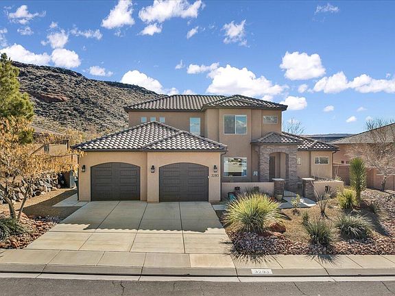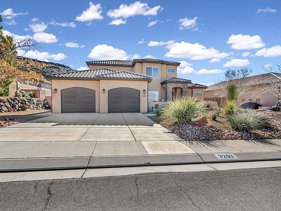 This exquisite Dixie Springs property offers unparalleled privacy with no neighbors built behind, providing a serene retreat. Enjoy the breathtaking views of Pine Valley from the rooftop balcony, or relax in the backyard oasis featuring beautiful red sand landscaping, a putting green, sandbox, and incredible pool with a shamu shelf and umbrella holder. Warm up by the gas-propane firepit or take in the scenery from the covered patio, this is an entertainer's dream! This incredibly well-maintained home feels like new offering premium tile floors, carpets that are as good as brand new, granite countertops throughout, two family rooms, a laundry room with a sink and ample storage, and amazing kitchen with a large corner pantry, and spacious island perfect for gathering. The 10 ft ceilings and open floor plan create a light and bright atmosphere throughout, making every corner feel inviting and spacious. Enjoy the great sized bedrooms including an en-suite bedroom upstairs, and the spacious master suite is a retreat providing direct access to the backyard, a walk-in shower, dual vanity, and roomy walk-in closet. Centrally located on a very private road within Dixie Springs, nearby to a large community park, Sand Hollow reservoir, and the sand dunes providing endless hiking, biking, ATV trails, boating, jet skiing, and more. Bring all the toys! The oversized, 2 car garage extends down the left side providing extra space, and the garage floors are painted for a polished finish. This home truly has it all - from the thoughtful design to the stunning views, creating an ideal living experience for you and your family. Fridge in the garage is excluded but negotiable. Buyer to verify all information, deemed reliable, however buyer to verify all info including utilities, rental restrictions, and HOA information if applicable. The listing Broker's offer of compensation is made only to participants of the MLS where the listing is filed.