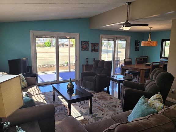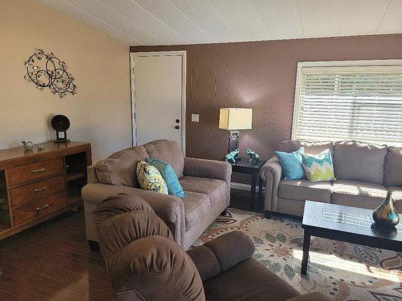55+. You OWN the land!! Spectacular home with marvelous golf views and a house that is immaculate in every way!! PLUS a one car garage with work bench! This upgraded home is pristine and beautifully decorated along with modern kitchen and stainless-steel appliances, useful on-trend barn doors, two dual pane sliding doors from living room onto patio and sparkling picture windows. A vaulted ceiling gives a spacious feel to the home. This home comes turnkey with tasteful and quality decor; you can just bring your suitcases. Both baths have been beautifully upgraded. There is laminate floor throughout. Outside you have a sweeping view of golf course and a full range of mountains. This home sits on the sunset view side with sunrise at the front patio. The back has beautifully designed patio with a full-size table and barbeque. A splendid place to entertain friends. This property is on one of the most desirable streets in Tri Palms Estates and Country Club - a residential, quiet neighborhood. Close to every amenity including Costco, Sams, shopping , casinos, theaters and hundreds of restaurants you have easy access to the freeway and a wonderful medical campus nearby. The clubhouse boasts two sparkling pools and spas plus restaurant and ownership comes with unlimited golf on two courses for two people. Home does not currently have a 433A permanent foundation but they are easy to install. Escrow cannot close until after January 1st because sellers will be using the home until the